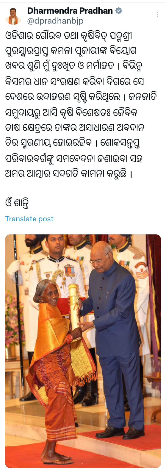 ଓଡ଼ିଶାର ବିଶିଷ୍ଟ କୃଷିବିତ୍ ପଦ୍ମଶ୍ରୀ କମଳା ପୂଜାରୀଙ୍କ ବିୟୋଗରେ କେନ୍ଦ୍ରମନ୍ତ୍ରୀଙ୍କ ଶୋ