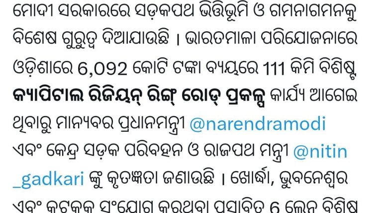 ଓଡ଼ିଶାର ଦୁଇଟି ପ୍ରମୁଖ ଜାତୀୟ ରାଜପଥ ପ୍ରକଳ୍ପ ସମ୍ପର୍କରେ କେନ୍ଦ୍ରମନ୍ତ୍ରୀଙ୍କ ଟ୍ୱିଟ୍