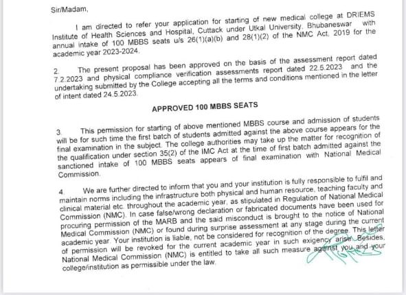 ୨୦୨୩-୨୪ ଶିକ୍ଷା ବର୍ଷ ପାଇଁ ଏହି କଲେଜ ଏମବିବିଏସ ପାଠ୍ୟକ୍ରମ ପାଇଁ ନାମଲେଖାଇ ପାରିବ ବୋଲି ଏନଏମସି ଜାରି କରିଥିବା ଚିଠିରୁ ଜଣାପଡ଼ିଛି। ଏହି ମେଡିକାଲ କଲେଜ କଟକରେ ପ୍ରଥମ ଘରୋଇ ମେଡିକାଲ ହେବ। ଏନଏମସି ଏମବିବିଏସ ନାମଲେଖା ପାଇଁ ଅନୁମତି ପ୍ରଦାନ କରିବା ସହିତ ରାଜ୍ୟ ସରକାରଙ୍କ ସ୍ୱାସ୍ଥ୍ୟ ବିଭାଗ, ଉତ୍କଳ ବିଶ୍ୱବିଦ୍ୟାଳୟ ଆଦିଙ୍କୁ ଅବଗତ କରାଇଛି ।
