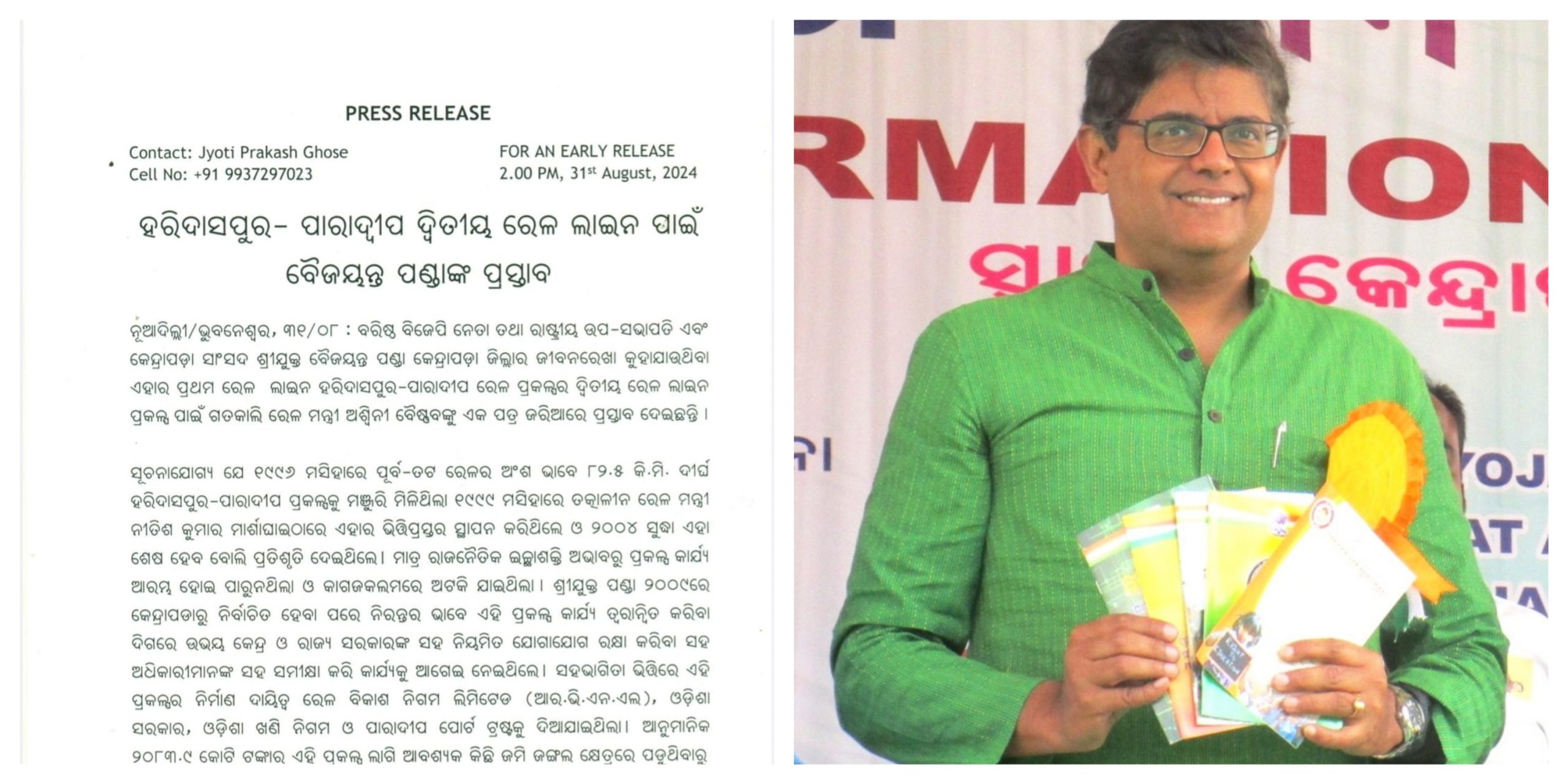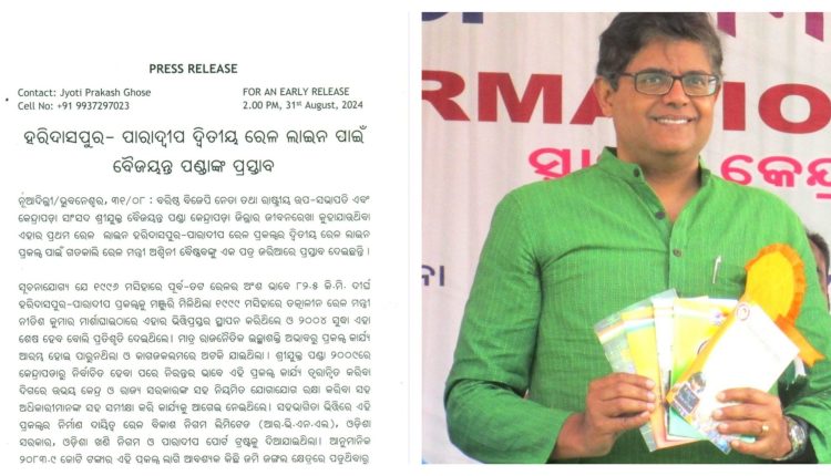 ଭୁବନେଶ୍ୱର: ହରିଦାସପୁର-ପାରାଦୀପ ଦ୍ବିତୀୟ ରେଳ ଲାଇନ୍ ପାଇଁ କେନ୍ଦ୍ରାପଡ଼ା ସାଂସଦ ବୈଜୟନ୍ତ ପଣ୍ଡାଙ୍କ ପ୍ରସ୍ତାବ l ଏନେଇ ରେଳ ମନ୍ତ୍ରୀ ଅଶ୍ବିନୀ ବୈଷ୍ଣବଙ୍କୁ ଚିଠି ଲେଖିଲେ ବୈଜୟନ୍ତ l ବୈଜୟନ୍ତଙ୍କ ଉଦ୍ୟମରେ ହରିଦାସପୁର-ପାରାଦୀପ ରେଳ ଲାଇନ୍ କାର୍ଯ୍ୟକ୍ଷମ ହୋଇଥିଲା l ଦୀର୍ଘବର୍ଷରୁ ପଡ଼ିଥିବା କାର୍ଯ୍ୟ ବୈଜୟନ୍ତଙ୍କ ଉଦ୍ୟମରେ ୨୦୧୯ରେ ଶେଷ ହୋଇଥିଲା l