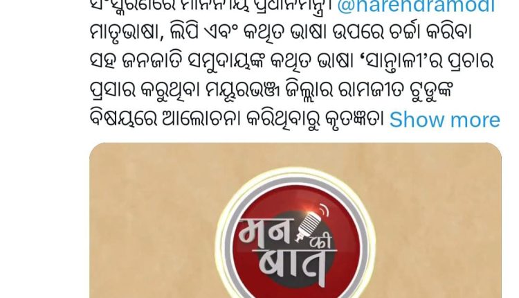 ନୂଆଦିଲ୍ଲୀ/ଭୁବନେଶ୍ୱର, ସେପ୍ଟେମ୍ବର ୨୯ – ‘ମନ୍ କୀ ବାତ୍ କାର୍ଯ୍ୟକ୍ରମ’ର ୧୦ ବର୍ଷ ପୂର୍ତ୍ତି ହେବାର ବିଶେଷ ସଂସ୍କରଣରେ ପ୍ରଧାନମନ୍ତ୍ରୀ ନରେନ୍ଦ୍ର ମୋଦୀ ମାତୃଭାଷା, ଲିପି ଏବଂ କଥିତ ଭାଷା ଉପରେ ଚର୍ଚ୍ଚା କରିବା ସହ ଜନଜାତି ସମୁଦାୟଙ୍କ କଥିତ ଭାଷା ‘ସାନ୍ତାଳୀ’ର ପ୍ରଚାର ପ୍ରସାର କରୁଥିବା ମୟୂରଭଞ୍ଜ ଜିଲ୍ଲାର ରାମଜୀତ ଟୁଡୁଙ୍କ ବିଷୟରେ ଆଲୋଚନା କରିଥିବାରୁ ତାଙ୍କୁ କୃତଜ୍ଞତା ଜ୍ଞାପନ କରିଛନ୍ତି କେନ୍ଦ୍ର ଶିକ୍ଷା ମନ୍ତ୍ରୀ ଧର୍ମେନ୍ଦ୍ର ପ୍ରଧାନ।
