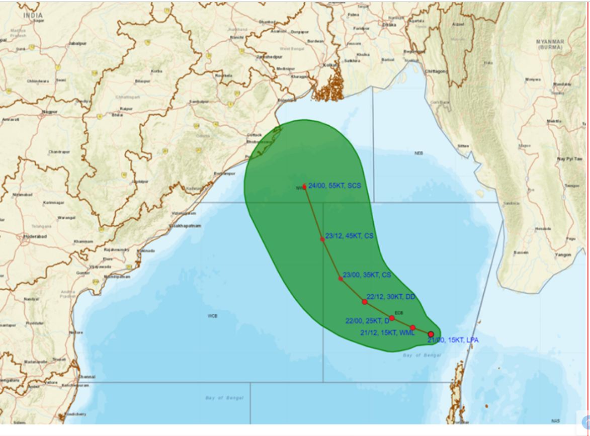 ବଙ୍ଗୋପସାଗରରେ ସୃଷ୍ଟି ହୋଇଥିବା ଲଘୁଚାପ କ୍ଷେତ୍ର ପଶ୍ଚିମ ଉତ୍ତର-ପଶ୍ଚିମ ଦିଗରେ ଗତିକରି ଓ୍ବେଲମାର୍କ ଲୋ ପ୍ରେସରରେ ପରିଣତ ହେବା ପରେ ମଙ୍ଗଳବାର ସକାଳେ ଅବପାତର ରୂପ ନେବ । ସଂଧ୍ୟାରେ ଗଭୀର ଅବପାତ ଓ ୨୩ତାରିଖ ସୁଦ୍ଧା ବାତ୍ୟାରେ ପରିଣତ ହେବ । ସମ୍ଭାବ୍ୟ ବାତ୍ୟାର ନାଁ ଦାନା ରଖାଯାଇଛି । ବାତ୍ୟା ରୂପ ନେଇ ଓଡିଶା ଓ ପଶ୍ଚିମବଙ୍ଗ ଉପକୂଳ ଆଡକୁ ମୁହାଁଇବ ଦାନା। ଆହୁରି ଘନୀଭୂତ ହୋଇ ଭୀଷଣ ବାତ୍ୟାରେ ପରିଣତ ହେବ। ପୁରୀରୁ ସାଗର ଦ୍ବୀପ ମଧ୍ୟରେ ୨୪ ଓ ୨୫ ତାରିଖ ମଧ୍ୟରେ ଏହା ଲ୍ୟାଣ୍ଡଫଲ କରିପାରେ ବୋଲି ଅନୁମାନ କରିଛି ଆଇଏମଡି। ଏହି ସମୟରେ ପବନର ବେଗ ଘଣ୍ଟାକୁ ୧୦୦ରୁ ୧୨୦ କିଲୋମିଟର ରହିପାରେ।