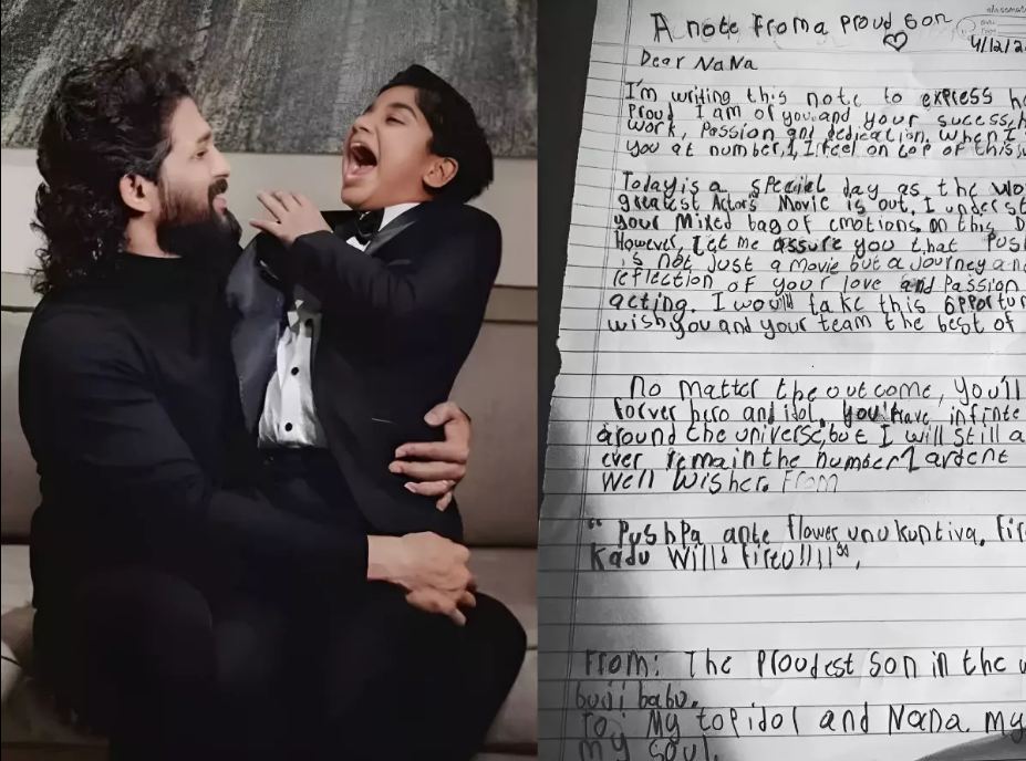 ଅୟାନର ସେହି ଚିଠିଟିକୁ ନିଜ ଇନଷ୍ଟାଗ୍ରାମ ଷ୍ଟୋରୀରେ ସେୟାର କରିଛନ୍ତି ପୁଷ୍ପାରାଜ୍ ‘ଅଲ୍ଲୁ’ । ଯେଉଁଥିରେ ନିଜ କୁନି ହାତରେ ଅଙ୍କାବଙ୍କା ଅକ୍ଷରରେ ଅୟାନ୍ ଲେଖିଛି, ‘ପ୍ରିୟ ବାପା, ତୁମର ସଫଳତା, କଠିନ ପରିଶ୍ରମ ଏବଂ ଉତ୍ସାହ ପାଇଁ ମୁଁ କେତେ ଗର୍ବିତ ଅନୁଭବ କରୁଛି ତାହା ଜଣାଇବାକୁ ମୁଁ ଏହି ଚିଠି ଲେଖୁଛି । ଯେତେବେଳେ ମୁଁ ତୁମକୁ  ନମ୍ବର ୧ରେ ଦେଖେ, ସେତେବେଳେ ମୋତେ ଲାଗେ ଯେ ମୁଁ ଦୁନିଆର ଶୀର୍ଷରେ ଅଛି । ଆଜି ବିଶେଷ ଦିନ । କାରଣ ଆଜି ବିଶ୍ବର ସବୁଠାରୁ ବଡ ଆକ୍ସନ ଫିଲ୍ମ ରିଲିଜ୍ ହୋଇଯାଇଛି । ମୁଁ ବୁଝୁଛି ଏବେ ତୁମକୁ ମିଶ୍ରିତ ଭାବନା ଆସୁଥିବ । କିନ୍ତୁ ମୁଁ ଆପଣଙ୍କୁ କଥା ଏହା କହିବାକୁ ଚାହେଁ ଯେ ପୁଷ୍ପା କେବଳ ଏକ ଚଳଚ୍ଚିତ୍ର ନୁହେଁ ବରଂ ଅଭିନୟ ପ୍ରତି ଆପଣଙ୍କର ଉତ୍ସାହ ଏବଂ ଭଲପାଇବାର ପ୍ରତିଫଳନ । ତେଣୁ ଏହି ମୁହୂର୍ତ୍ତଟିକୁ ଉପଯୋଗ ମୁଁ ତୁମକୁ ଏବଂ ତୁମର ପୂରା ଟିମକୁ ଶୁଭକାମନା ଜଣାଉଛି । ଅୟାନ ଆହୁରି ଲେଖିଛି, ଫଳାଫଳ ଯାହା ହେଉନା କାହିଁକି, ତୁମେ ସବୁବେଳେ ମୋର ହିରୋ ଏବଂ ଆଇଡଲ ରହିବ । ତୁମର ବିଶ୍ବରେ ଅନେକ ପ୍ରଶଂସକ ଅଛନ୍ତି, ତଥାପି ମୁଁ ତୁମର ନମ୍ବର ୧ ପ୍ରଶଂସକ ରହିବି । ଜଣେ ଗର୍ବିତ ପୁଅ ତାର ଟପ୍ ଆଇଡଲ ପାଇଁ ଏହି ନୋଟଟି ଲେଖିଛି ।’