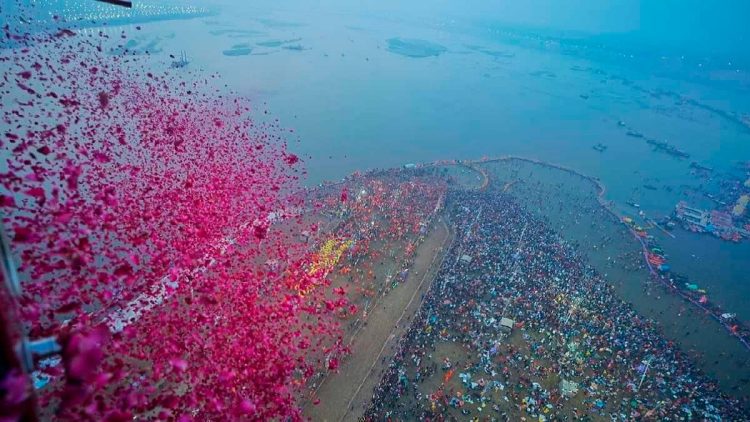 ଏହି ଅବସରରେ ଶ୍ରଦ୍ଧାଳୁଙ୍କ ଉପରେ ହେଲିକପ୍ଟରରୁ ଫୁଲ ବର୍ଷା କରାଯାଇଥିଲା। ଆଖଡ଼ାମାନେ ସେମାନଙ୍କର ଅମୃତ ସ୍ନାନ ଜାରି ରଖିଥିବା ସମୟରେ ସକାଳ ୬ଟା ୩୦ମି.ରୁ ପୁଷ୍ପବୃଷ୍ଟି ଆରମ୍ଭ ହୋଇଥିଲା। ଗୋଲାପ ପାଖୁଡ଼ାର ବର୍ଷା ଦେଖି ସଙ୍ଗମ କୂଳରେ ଉପସ୍ଥିତ ନାଗା ସନ୍ୟାସୀ, ସନ୍ଥ ଏବଂ ଭକ୍ତମାନେ ଅଭିଭୂତ ହୋଇ ଜୟ ଶ୍ରୀ ରାମ ଏବଂ ହର ହର ମହାଦେବ ଉଚ୍ଚାରଣ କରିଥିଲେ।