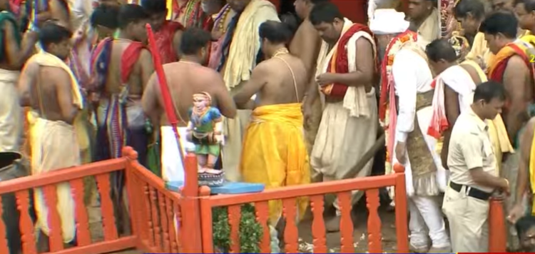 ପୁରୀ: ପବିତ୍ର ରଥଯାତ୍ରାରେ ଶୁକ୍ରବାର ଦିନ ରଥ ଟଣା ଆରମ୍ଭ ହେବା ପୂର୍ବରୁ ପୁରୀର ଗଜପତି ମହାରାଜା ଦିବ୍ୟସିଂହ ଦେବ ତିନି ଠାକୁରଙ୍କ ଛେରା ପହଁରା ନୀତି କରିଛନ୍ତି।