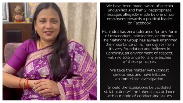 ଏକ୍ସର ଏକ ପୋଷ୍ଟରେ କମ୍ପାନୀ କହିଛି ଯେ ଏହି ମାମଲାକୁ ଅତ୍ୟନ୍ତ ଗମ୍ଭୀରତାର ସହିତ ନିଆଯାଇଛି ଏବଂ ଏହାର ତୁରନ୍ତ ତଦନ୍ତ ଆରମ୍ଭ କରାଯାଇଛି। “ଆମ କର୍ମଚାରୀମାନଙ୍କ ମଧ୍ୟରୁ ଜଣେ ଫେସବୁକରେ ରାଜନେତାଙ୍କ ପ୍ରତି କରିଥିବା ପୋଷ୍ଟ ନେଇ ଆମେ ଅବଗତ ହୋଇଛୁ। ମହିନ୍ଦ୍ରା ଗ୍ରୁପ୍ ସର୍ବଦା ମାନବିକ ମର୍ଯ୍ୟାଦା ଉପରେ ଗୁରୁତ୍ଵାରୋପ କରିଥାଏ ଏବଂ ନୀତିର କୌଣସି ଉଲ୍ଲଂଘନକୁ ସହ୍ୟ କରେ ନାହିଁ।