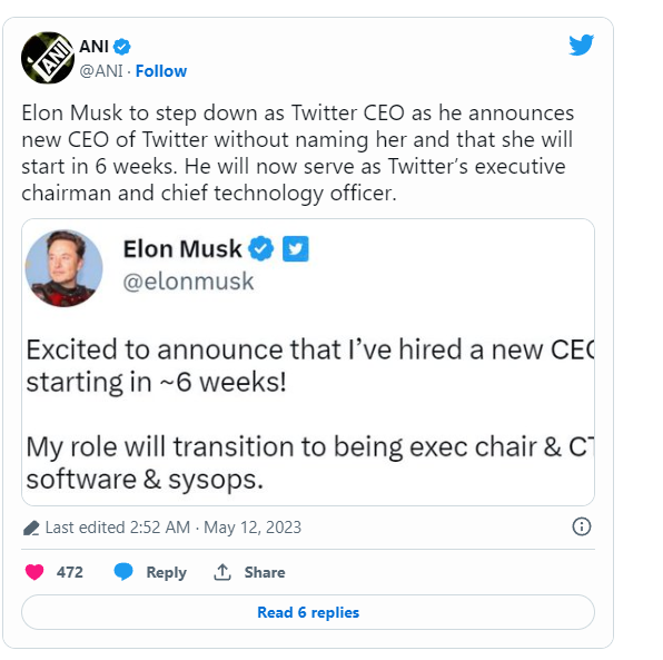 • ପଦରୁ ଇସ୍ତଫା ଦେବେ ମସ୍କ ? ଟ୍ୱିଟ କଲେ ମହିଳା ଉତ୍ତରାଧିକାରୀଙ୍କ ନାମ