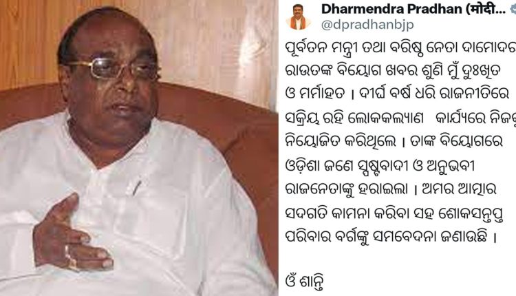 ପୂର୍ବତନ ମନ୍ତ୍ରୀ ଦାମୋଦର ରାଉତଙ୍କ ବିୟୋଗରେ କେନ୍ଦ୍ରମନ୍ତ୍ରୀଙ୍କ ଶୋକ